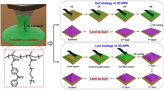 Figure 1. Schematic diagrams illustrating the ink transport with photo-crosslinkable copolymer ink, and 3D-DPN by dot strategy or line strategy.