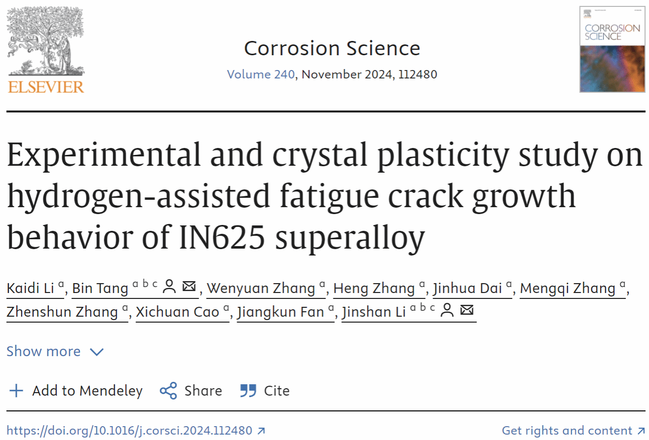 The research, titled “Experimental and Crystal Plasticity Study on Hydrogen-Assisted Fatigue Crack Growth Behavior of IN625 Superalloy” has been published in the leading corrosion journal Corrosion Science (DOI: 10.1016/j.corsci.2024.112480). The corresponding authors are Professor Jinshan Li and Professor Bin Tang from the State Key Laboratory of Solidification Technology, and the first author is Ph.D candidate Kaidi Li. This work was supported by the National Science and Technology Major Project (J2019-VI-0023-0140).
