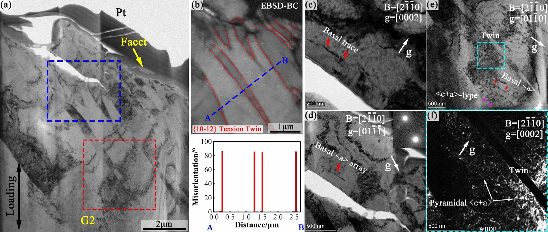 Recently, Professor Zeng Weidong's team at the School of Materials, Northwestern Polytechnical University (NPU), in collaboration with Wang Qingjiang's team at the Institute of Metals, Chinese Academy of Sciences (IMS, CAS), found for the first time that dwell load-induced twinning preferentially coordinates the deformation of (0001) basal grains as well as retards the basal crack propagation caused by basal slip in the near-alpha Ti60 alloy, which improves the fatigue resistance. Based on the soft/hard grain crack nucleation model for dwell fatigue, a new possible mechanism for the soft (P)/hard (B) grain PB interface to participate in twin nucleation is proposed. The high density of pyramidal < c+a > dislocations within the twins and their decomposition to form basal stacking faults (SFTs) with specific nanometre spacing make the coordination process accompanied by significant lattice distortions within the twins. The newly formed nanotwin boundaries and SFTs in these basal grains act as barriers to dislocation motion, increasing the strength and dwell life of the near-α Ti60 alloy and effectively reducing the dwell sensitivity of the alloy. The results extend the understanding of the synergistic effects of dislocation slip, twin nucleation and the formation of basal SFTs in near-α titanium alloy DF, and emphasise that the introduction of twins and SFTs plays an important role in alleviating DF crack initiation and enhancing fatigue resistance. The related work was published in the Top1 journal in the field of plasticity, International Journal of Plasticity, under the title of " Near-α titanium alloy dwell load-induced deformation twinning to coordinate the deformation mechanism associated with crack initiation". The first author of this work is Boning Wang, a PhD student at the School of Materials, Northwestern Polytechnical University, and the corresponding author is Professor Weidong Zeng.