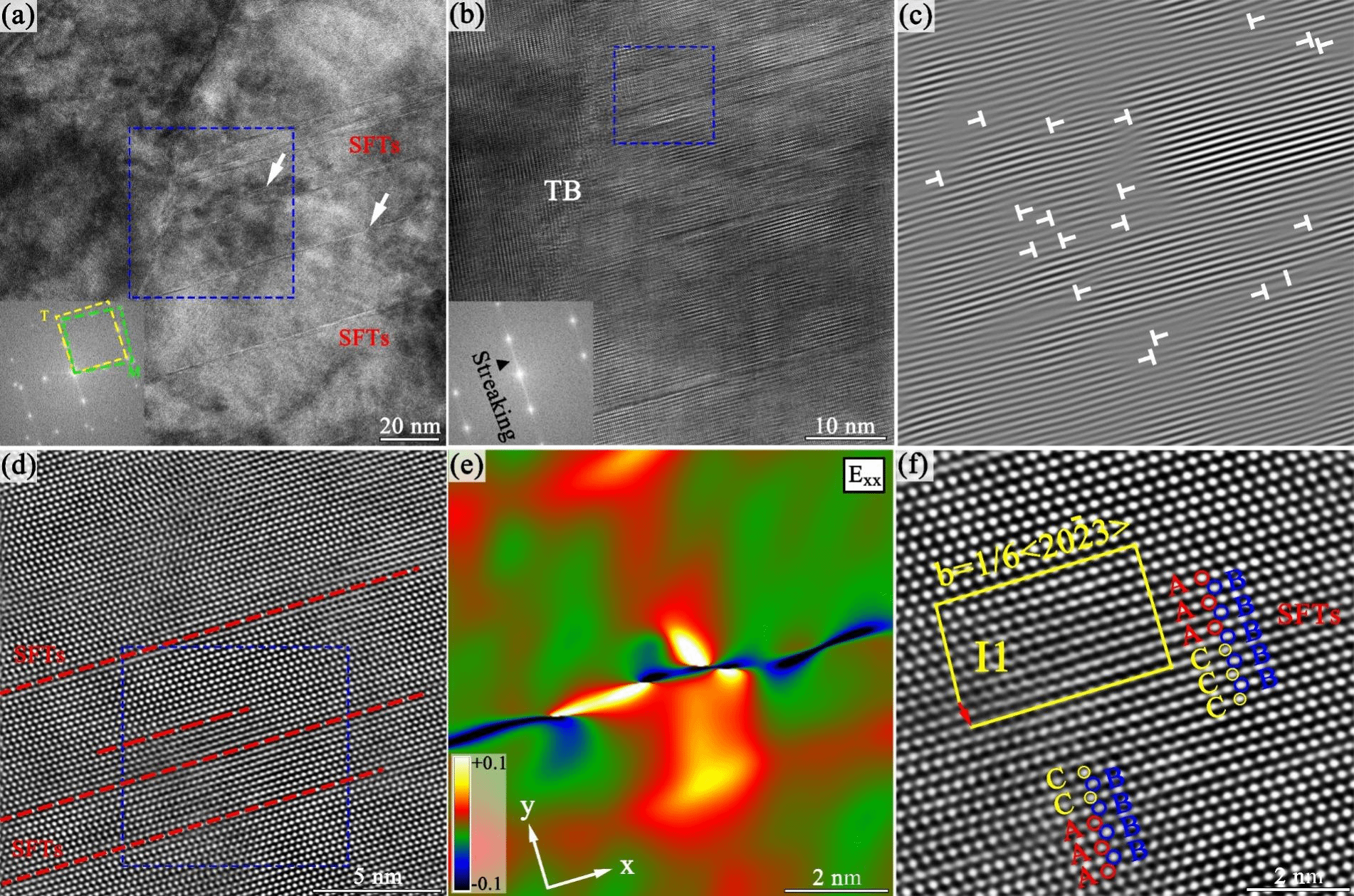 Fig. 5. Microstructure of twins and SFTs revealed by HR-TEM. (a-b) HR-TEM image and corresponding FFT showing SFTs in a {10-12} twin. (b) High magnification image of the blue dotted box in (a). (c) The blue dotted box in (b) corresponds to the (0002) basal plane IFFT image and dislocation characteristics. (d) Atomic-scale HAADF-STEM images of SFTs. (e) GPA analysis corresponding to the dotted box in (d). (f) HAADF-STEM image showing an I1 fault bounded by 1/6 < 2023 > Frank partial dislocations.