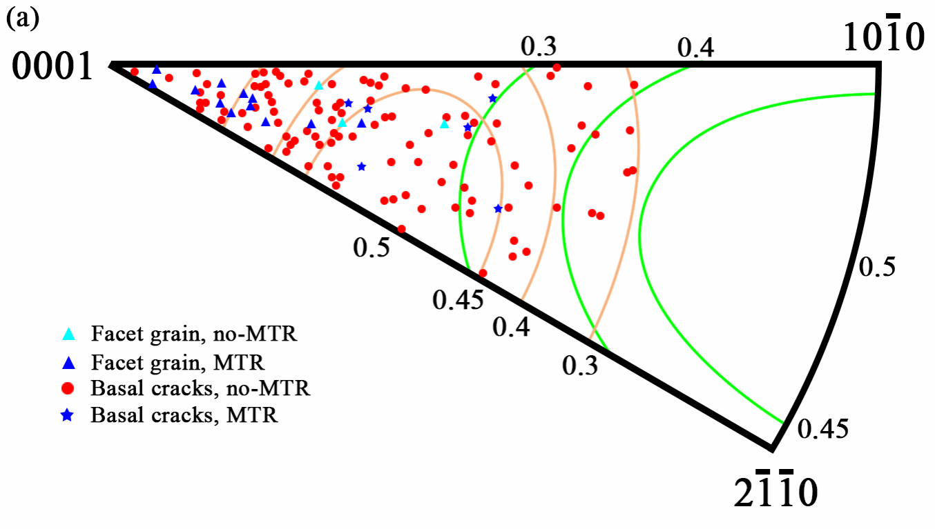 Fig. 3. Inverse pole figure of crystal orientation of the crack initiation grains and containing twins in DF samples with different micro-textures relative to the LD. The isocontours of the maximum SF correspond to, from left to right, the basal and prismatic slip systems, respectively.