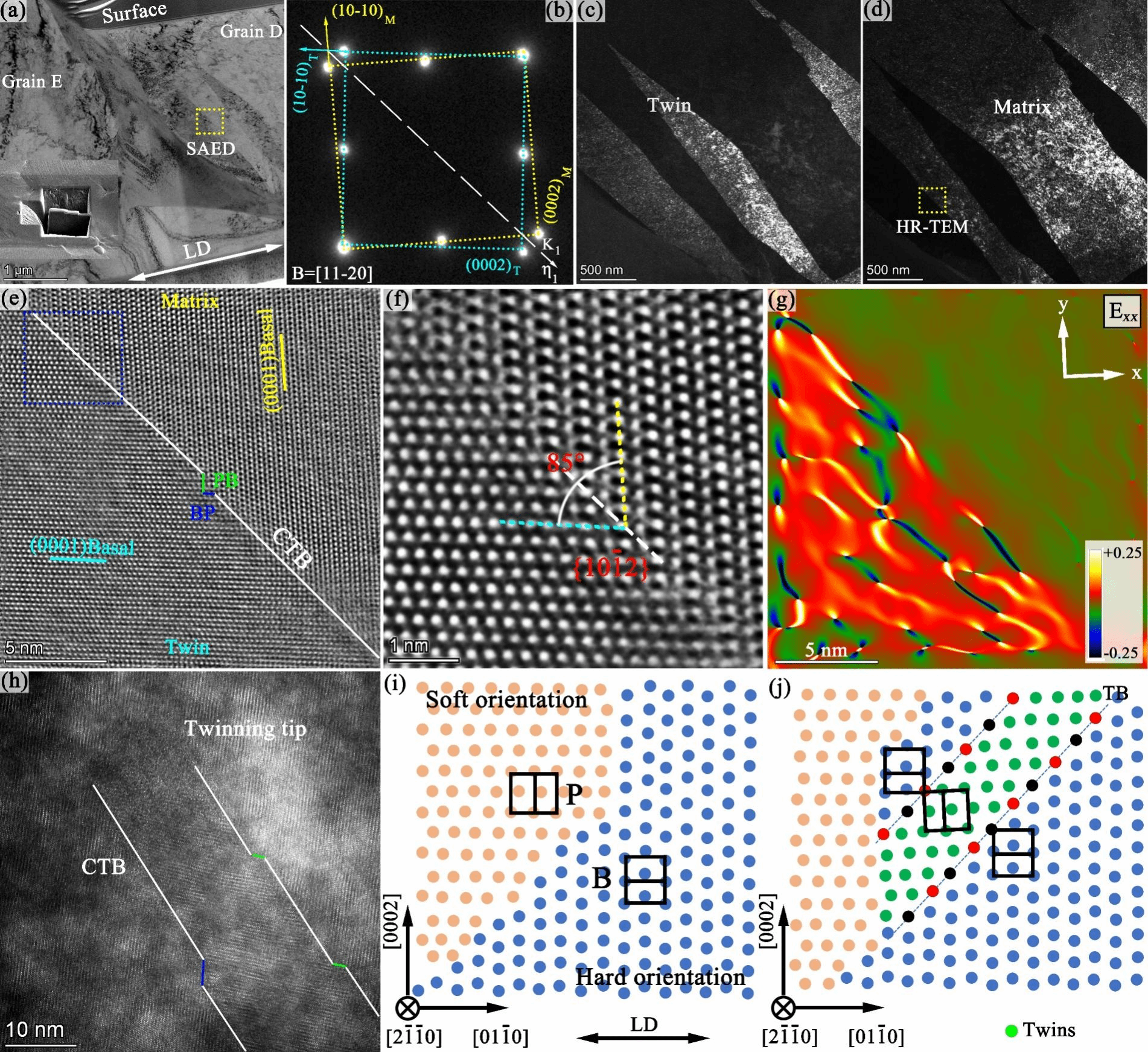 Fig. 4. (a) The morphology of the prepared FIB-TEM foils, (b) SAED pattern corresponding to the twin boundary (TB) in the region marked by the yellow dotted box in (a), with the zone axis [20], (c) and (d) Dark field images of the twin and matrix, respectively,  (e) Atomic-scale [20] HAADF-STEM image of the marker in (d) showing a TB, (f) Localized enlarged interface structure of HAADF-STEM in the blue dotted box region in (e), (g) In-plane (Exx) strain field maps obtained by GPA of the Fig .e HAADF-STEM image, (h) HR-TEM of the twin tips in Fig. c, (i) Atomic schematic of the PB/BP interface corresponding to the soft/hard grain prismatic plane and the basal plane, (j) Schematic representation of atoms with twinned nucleation in hard grains.