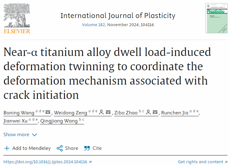 Boning Wang, Weidong Zeng*, Zibo Zhao*, Runchen Jia, Jianwei Xu, Qingjiang Wang, Near-α titanium alloy dwell load-induced deformation twinning to coordinate the deformation mechanism associated with crack initiation, International Journal of Plasticity. Volume 182, 2024, 104116. ISSN 0749-6419,